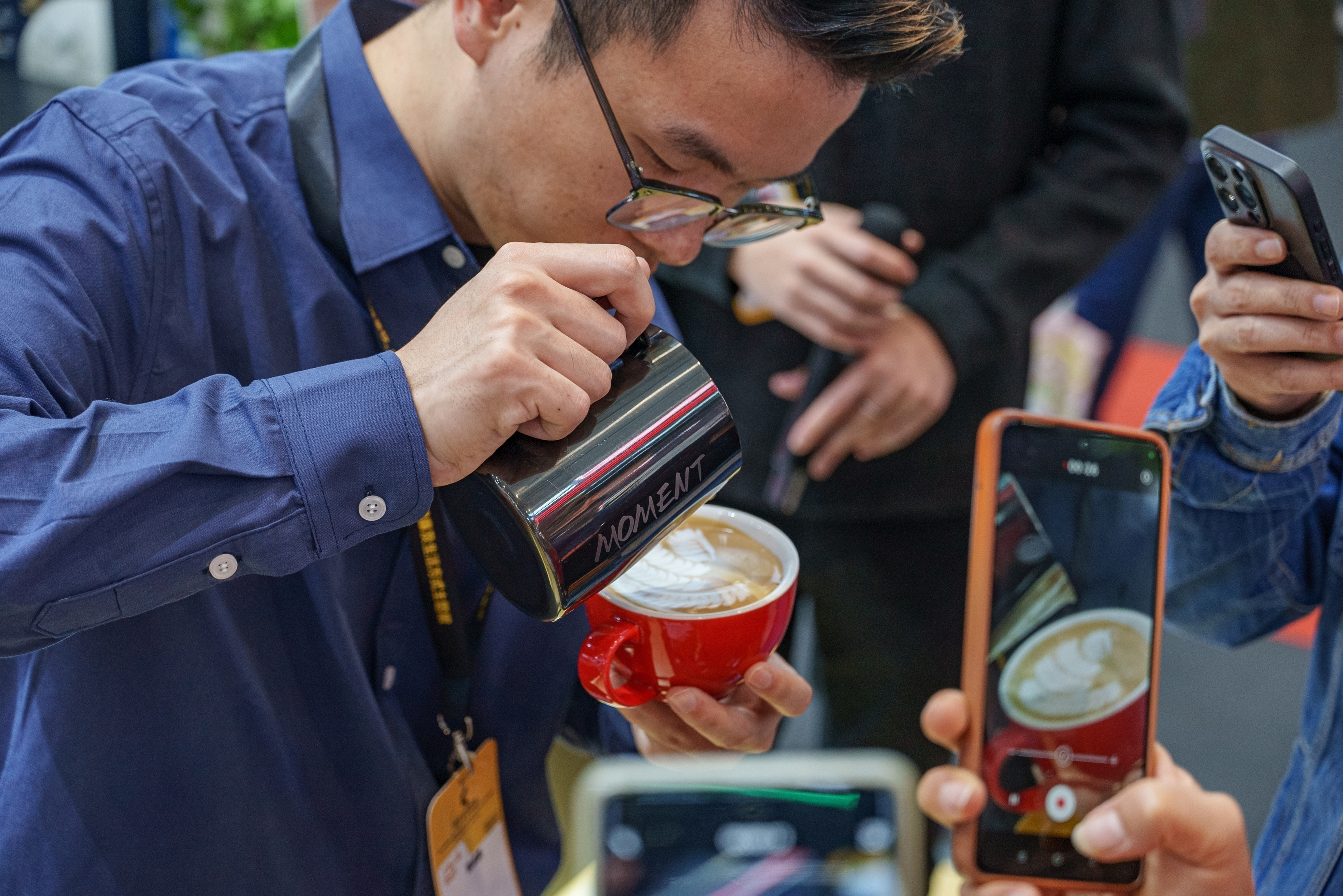 本次展会最受关注的,莫过于咖乐美与2025世界拉花艺术冠军陈卓豪的深度联动。这场拉花互动活动,不仅是一场视觉盛宴,更承载着重要的行业意义——以冠军影响力为载体,向大众宣导咖啡拉花的艺术魅力与咖啡文化的深层内涵,让更多人感受专业咖啡的独特价值。